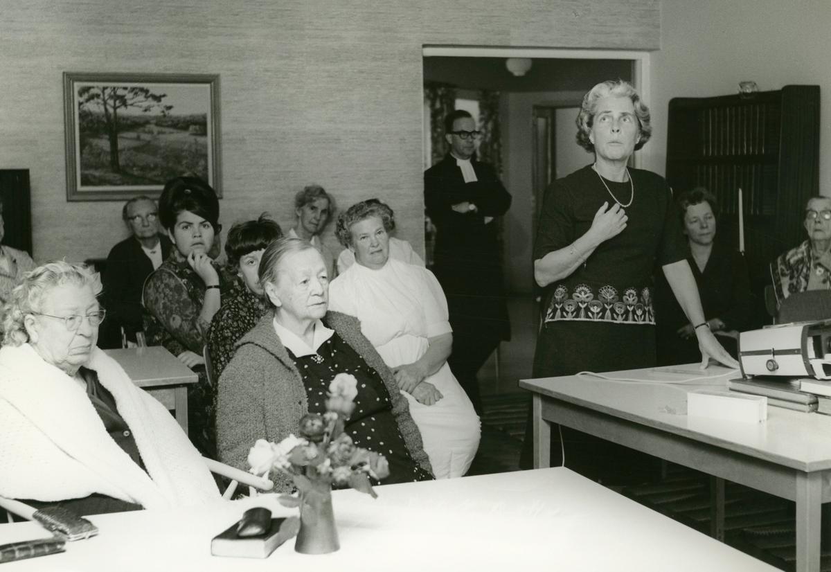 Diabildsvisning av prästfrun Märta Lindman i matsalen på Brattåshemmets ålderdomshem, 1960-tal. Från vänster: 1. Mathilda Bengtsson (född Apel 1894 - 1968 Dammkärr), 2. Okänd, 3. vårdbiträde Lena Englund Söderberg, 4. Okänd, 5. Selma Börjesson (Hökkullen), 6. Okänd, 7 vårdbiträde Asta Ögren, 8. komminister Gustaf Lindman (står i dörren), 9. hustrun Märta Lindman, 10. Ulla Eklund (Sagered) från socialnämnden samt 11. Olga Holmén (Vommedal).