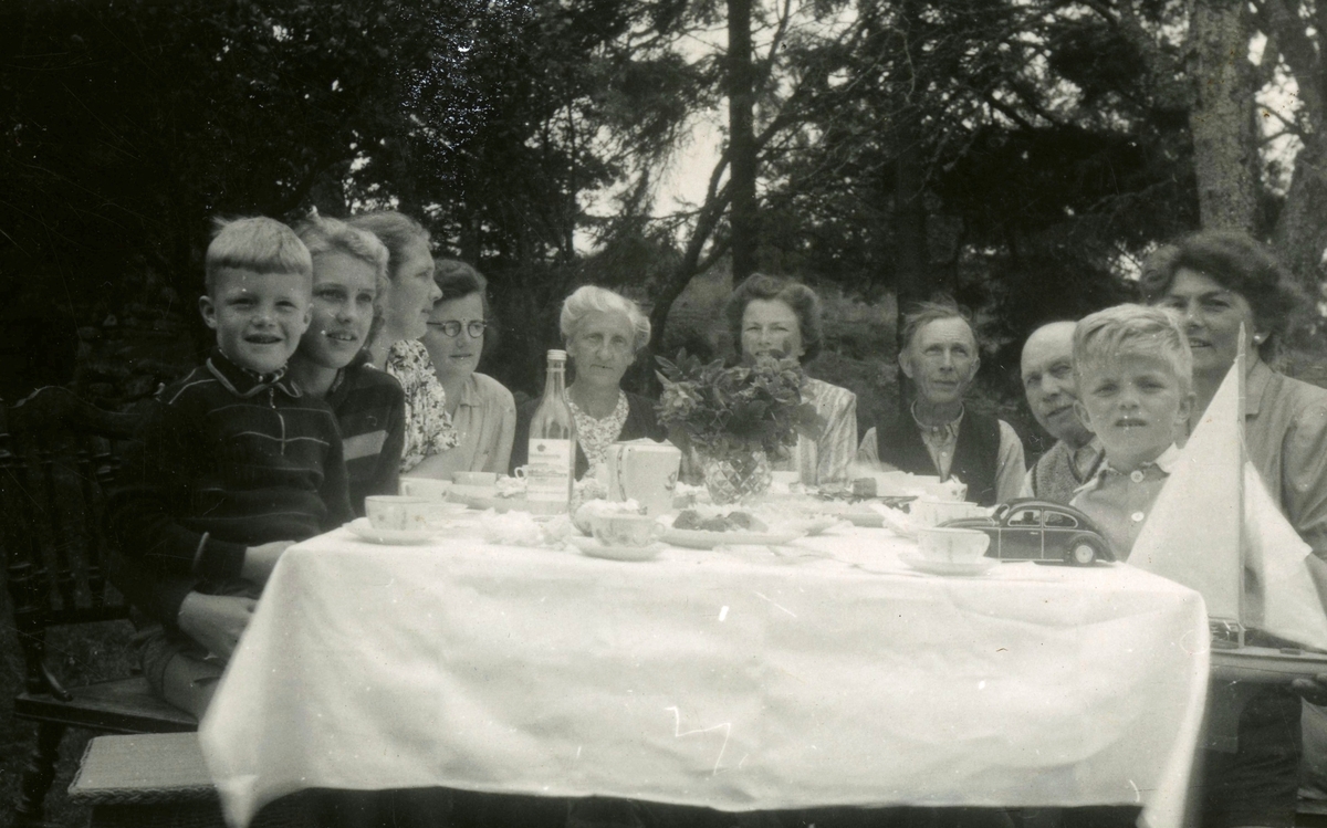 Sommargäster vid Tulebo Nordgård "Mattssons", 1930-tal. Från vänster: Lars-Erik Kahlman (1935 - 2012), Maud Wester (15 år), Vilma Wester, Fru Kahlman, Ester Larsson (Örgryte), Fru Sjöblom, Viktor Mattsson, Widegren (fru Sjöbloms far), Fröken Widegren och Karl Axel Sjöblom (1935 - ).