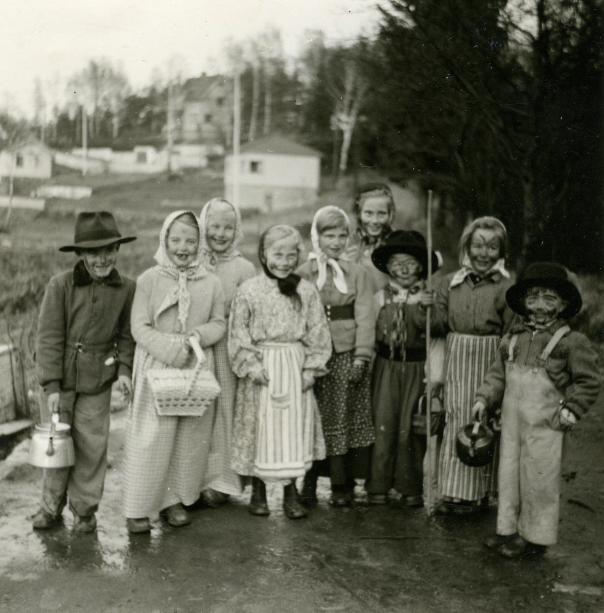 Påskklädda flickor och pojkar står i Torrekulla, cirka 1953 - 1956. Från vänster: 1. Dan Bernhardsson, 2. Monica Börjesson, 3. Lena Börjesson, 4. Karin Pettersson (född 1947), 5. Britt-Marie Larsson, 6. Eva Pettersson (född 1944), 7. Sven-Göran Olsson (född 1947), 8. Lisbeth Olsson och 9. Lennart Hillerström (född 1948).