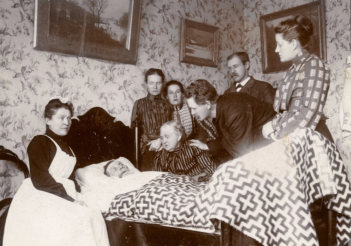Fabrikör Erik Bengtsson (född 1832 i Lilla Vommedal, död 1904 i 36 kv. Lundby, Sommarnäs på Hisingen), ligger på sin dödsbädd. Till vänster sitter en sjuksköterska och till höger sitter den sörjande hustrun Anna Christina Eriksdotter (1833 född i Västra Frölund - 1908). Bakre raden från vänster: 1. Okänd, 2. Okänd, 3. sonen Johannes Bengtsson (1873 - 1942) som tröstar modern. 4. Okänd. 5. dottern Maria Berta Persson. Erik Bengtsson var ägare till ett sågverk i Lundby på Hisingen. Relaterat motiv: A1867.