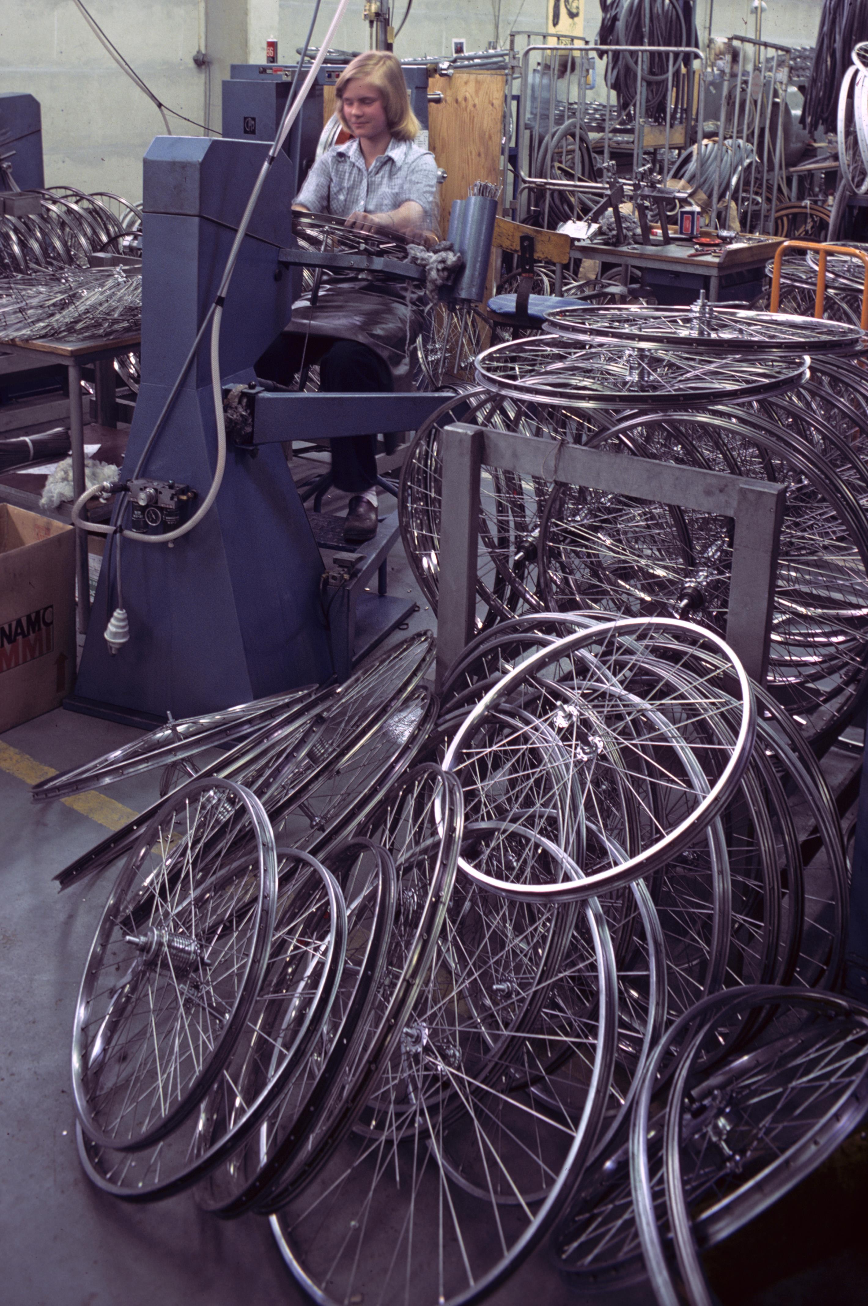 Tillverkning av cyklar. Bilden troligen från mitten av 1970-talet.