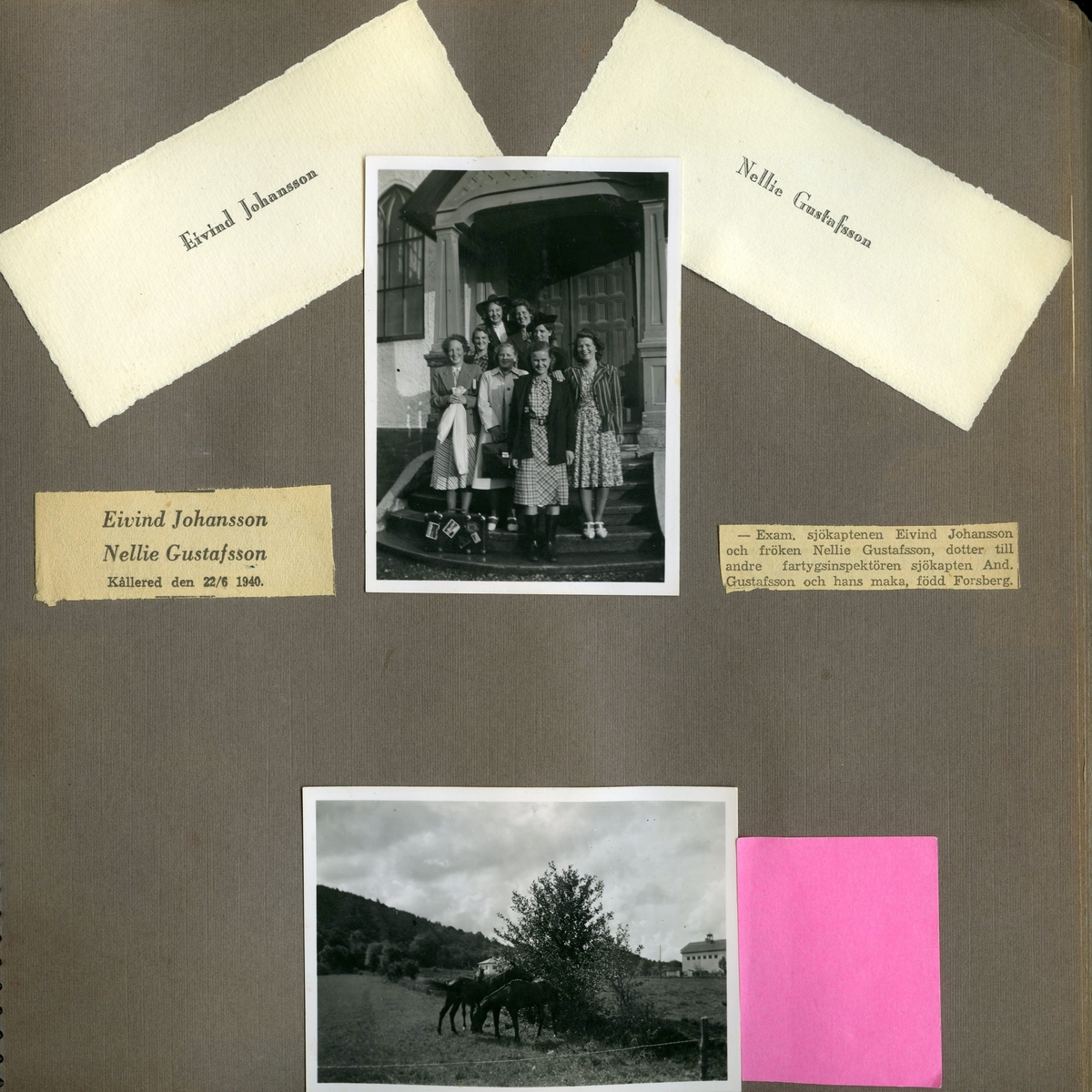 Minnescollage från vigseln mellan Nellie Gustafsson och sjökapten Eivind "Eje" Johansson (senare Kullbring) i Kållereds kyrka 22/6 1940. Ett foto där nio kvinnor står på trappan till Kållereds missinonskyrka på Labackavägen. Längst fram i mitten står Nellie Gustafsson, längre bak står Mary Ekman i hatt samt Rut Lind. Det finns också två via etiketter med brudparets namn på samt två tidningsannonser. Nedre fotot verkar inte höra till detta sammanhanget.