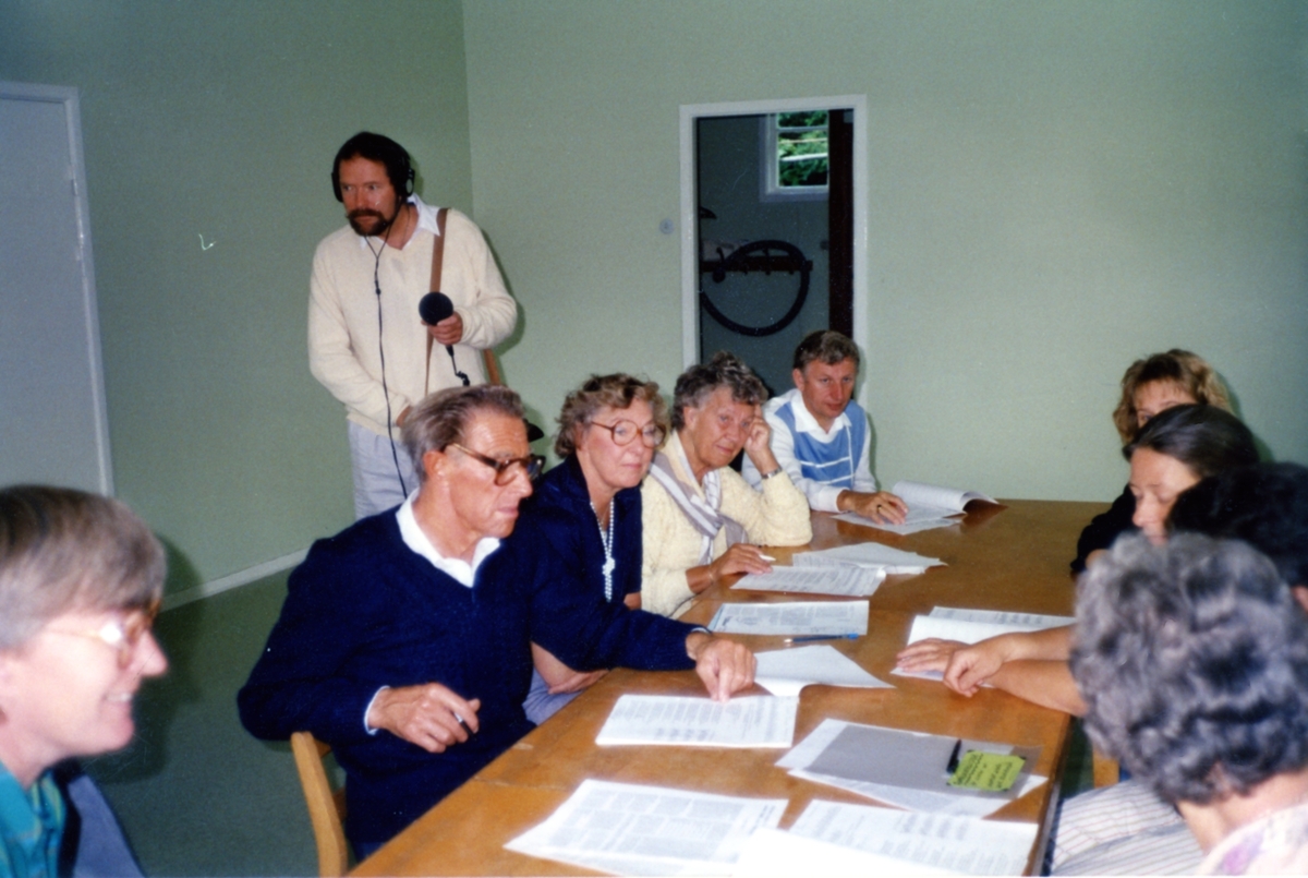 Repetition inför Bygdespelet "Brandskatten" i B-salen, Kållereds Kommunalhus (Streteredsvägen 3) 1986/87. Från vänster: 1. Britta Andersson, Kvarnby Folkdanslag. 2. Henrik Lundell, PRO-kören Kållered. 3. Solveig Mattsson, Visans Vänner, Kållered. 4. Stina Svensson, SPF-kören Kållered. 5. Erling Alriksson, SV, Kållered. 6. (skymd) projektledare Eva Ågren, SV. 7. Rigmor Lindqvist, Kvarnby Folkdanslag, Mölndal. Stående till vänster: en okänd man (troligtvis reporter från Mölndals-Posten) med mikrofon, ljudutrustning och hörlurar. Relaterade motiv: A3186 - A3251.