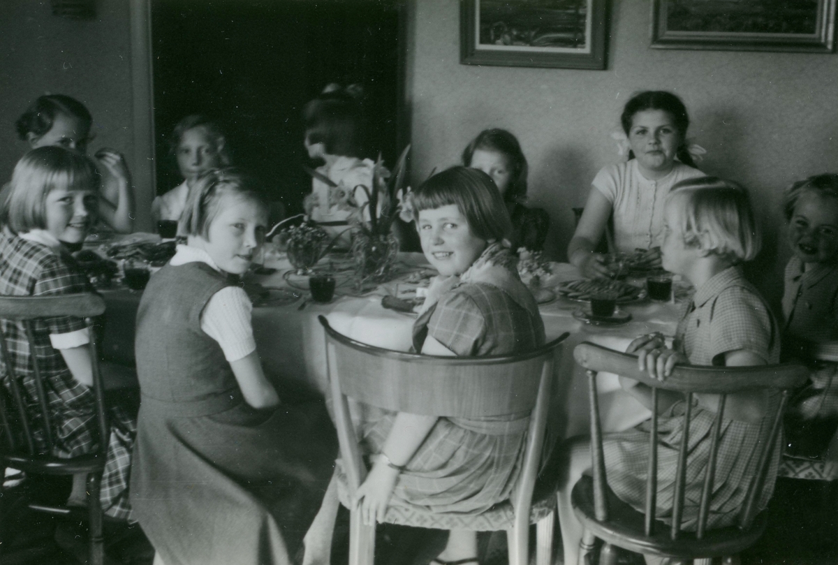 Barnkalas för Eva Pettersson (född 1944) som fyller 10 år, Gamlehagsvägen 17 år 1954. Bakre rad från vänster: 1. kusinen Stina Krantz, 2. lillasyster Karin Pettersson (gift Hansson), 3. Okänd, 4 Marie-Louise Larsson, 5. Lena Englund Söderberg. Främre rad från vänster: 1 Siv Olofsson, 2. Lillemor Pettersson, 3. Liselotte Karlsson, 4 Lena Börjesson, 5. (skymd) Monica Börjesson.