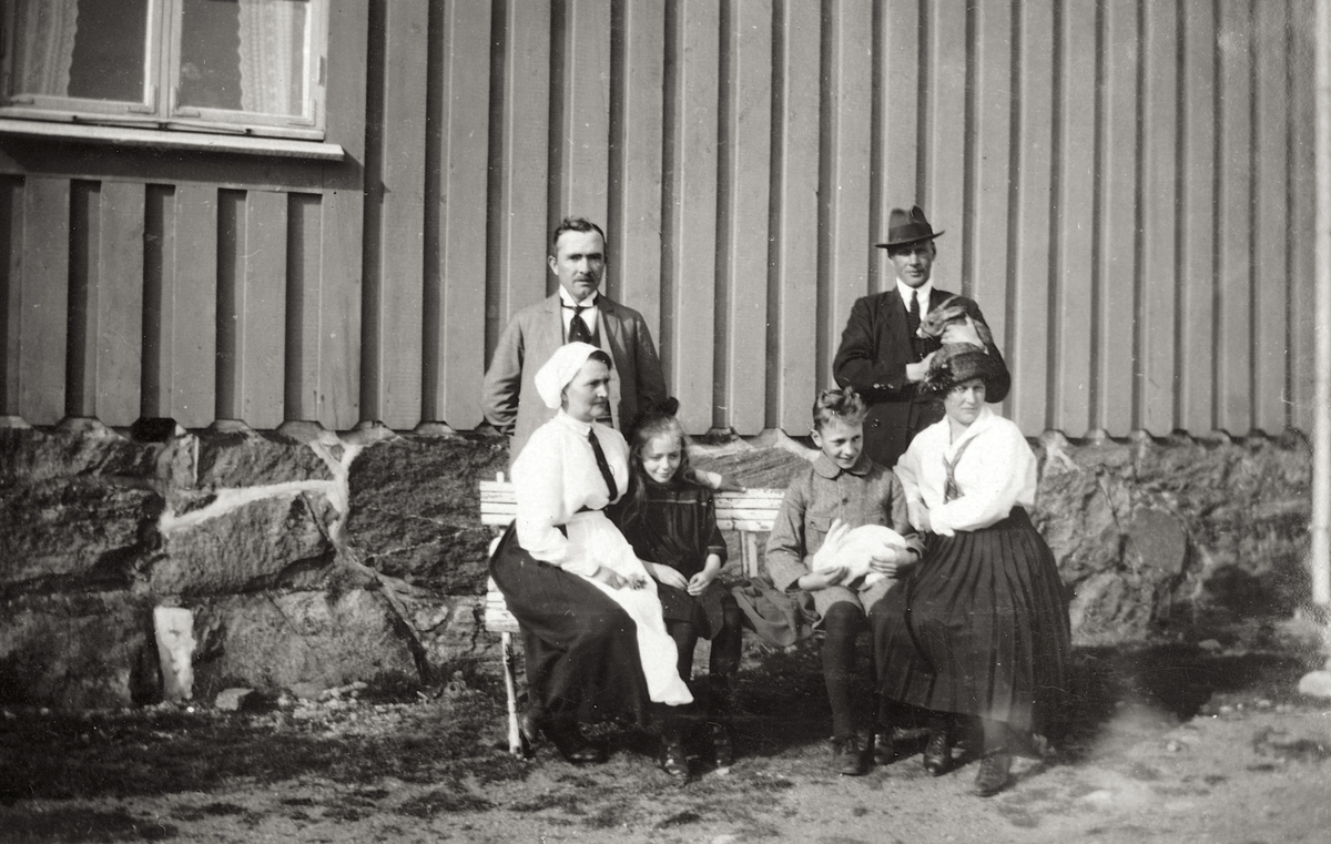 Makarna Holmberg är på väg till USA, Stretered år 1923. Överst från vänster: Carl Krantz (1880 - 1956) och Karl Holmberg med en kanin i famnen. Sittande från vänster: Nora Krantz (1879 - 1955), dottern Rosa Krantz Pettersson (1912 - 1994), sonen Östen Krantz (1910 - 1990) med en kanin i knät samt Ida Holmberg (Noras syster). Både Nora och Carl Krantz var anställda på Stretered och byggnaden de sitter utanför var deras personalbostad på Tulebovägen 23-27.