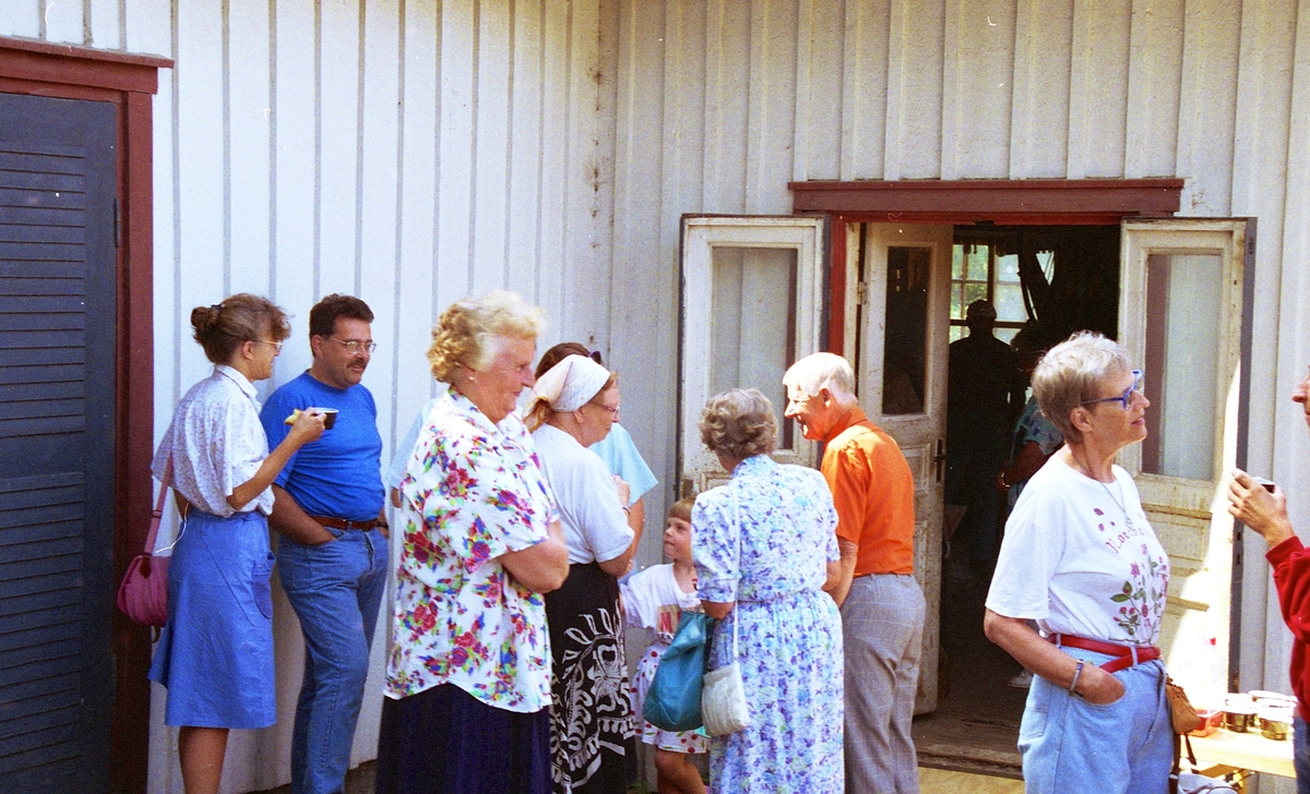 Invigning av Ekebackens Hantverksgård (tidigare John Lindströms möbelsnickeri) på Gamla Riksvägen 81, början av 1990-talet. Från vänster: 1. Berit Thalenius (Labacka), 2. Staffan Bjerrhede (Vommedal), 3. Ingegerd Lundell (Kållered), 4. Ulla Andersson (Sporred), 5. skymd i turkos tröja, 6. flickan Julia Lundin, 7. Gunvor Johansson, 8. Göthe Andersson (Sporred) och 9. Maj Werner (Livered).