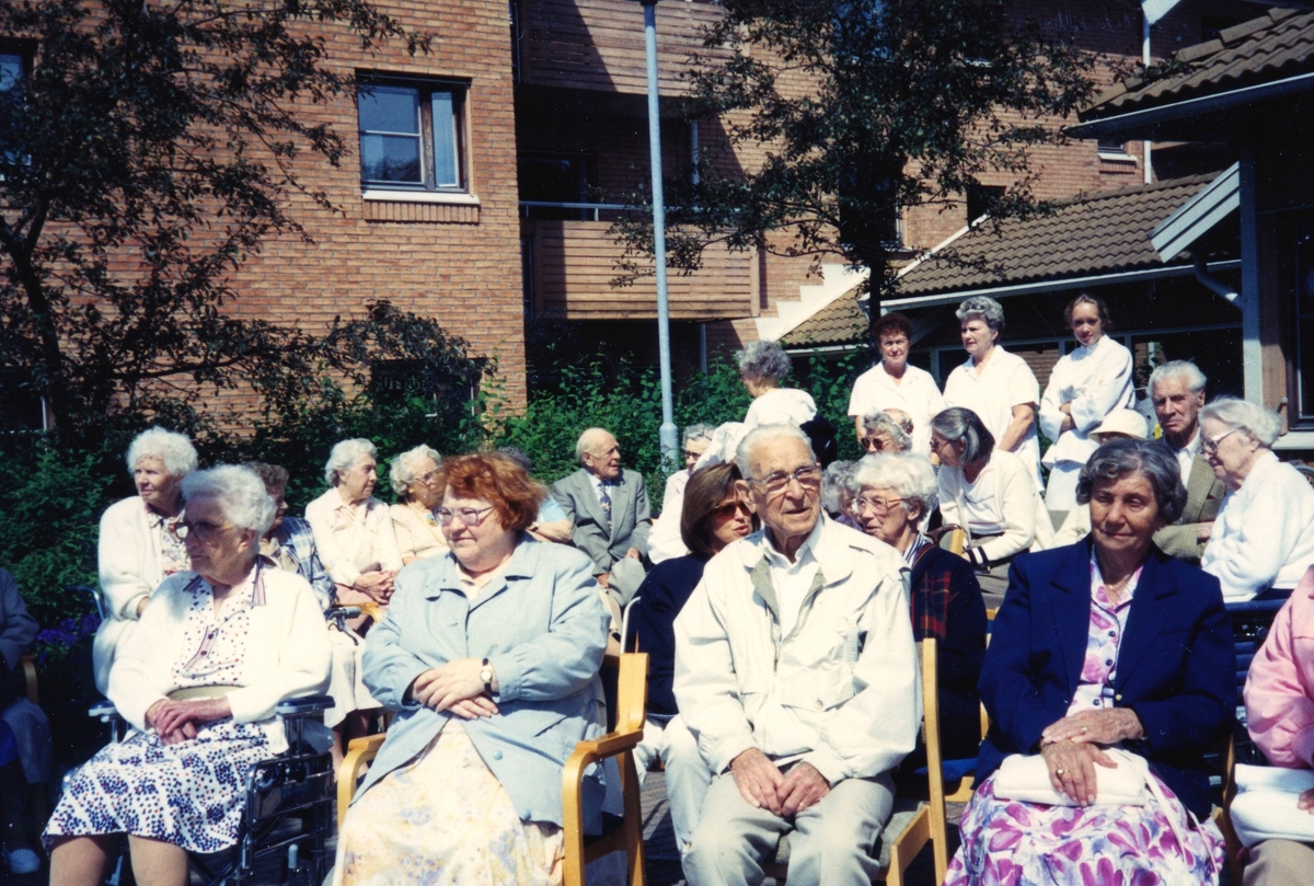 Boende på Brattåsgårdens äldreboende sitter utomhus då det firas midsommar, 1990-tal. Främre raden från vänster: 1. Hulda Olsson, 2. Gunvor Olsson, 3. Okänd, 4. Gunvor Johansson. Andra raden: 1. Aina Olsson (1917 - 2007), 2. Karin Zackrisson, 3-5. Okända, 6. Anna Maj Johansson, 7. köksbiträde Edit Johnsson, 8. Eva, 9. Oskar och Svea Jonasson.