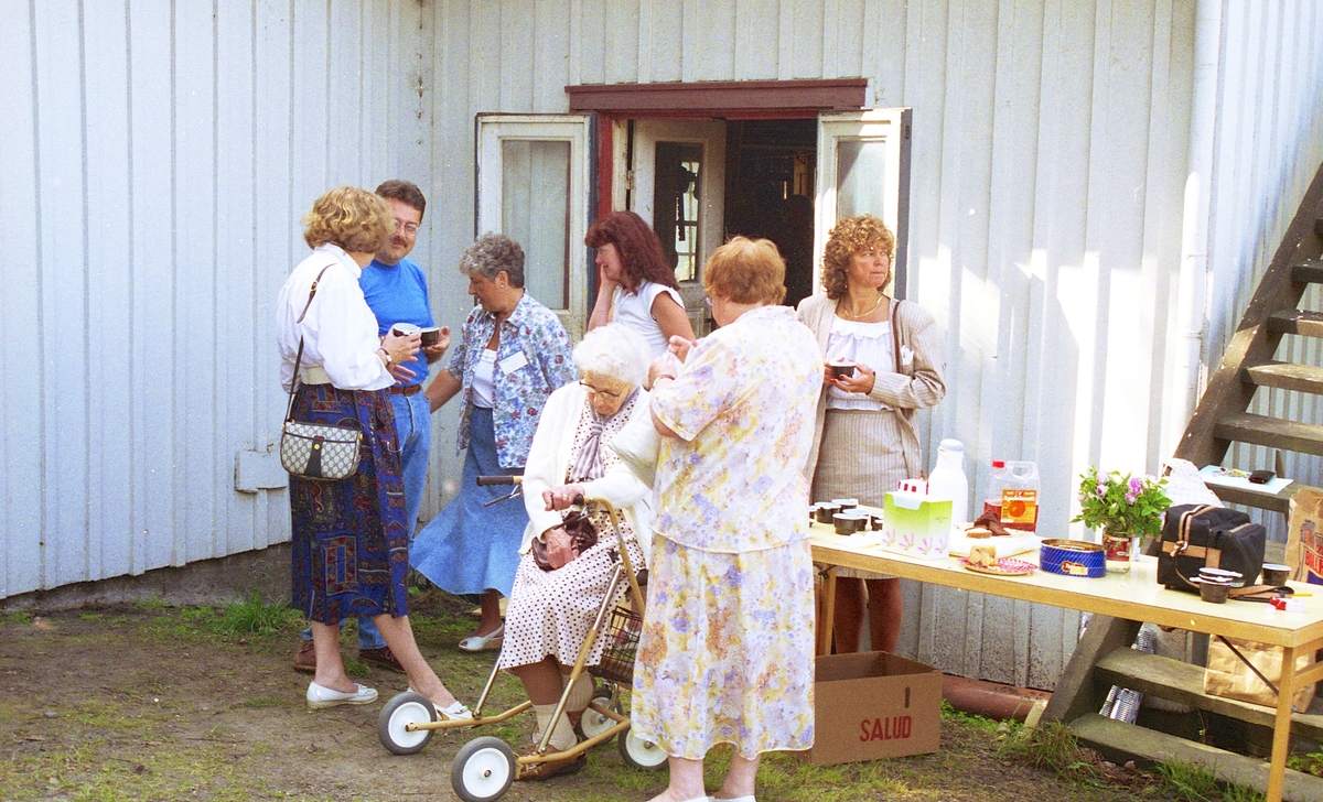 Invigning av Ekebackens Hantverksgård (tidigare John Lindströms möbelsnickeri) på Gamla Riksvägen 81, början av 1990-talet. Från vänster: 1 okänd, 2. Staffan Bjerrhede, 3. Gun Flygare (Vuxenskolan), 4. Marie Berg (Vuxenskolan, mörkt hår), 5. Hulda Olsson (med rullator), 6. Gunvor Olsson (rygg åt kameran) samt 8. representant från Medborgarskolan.