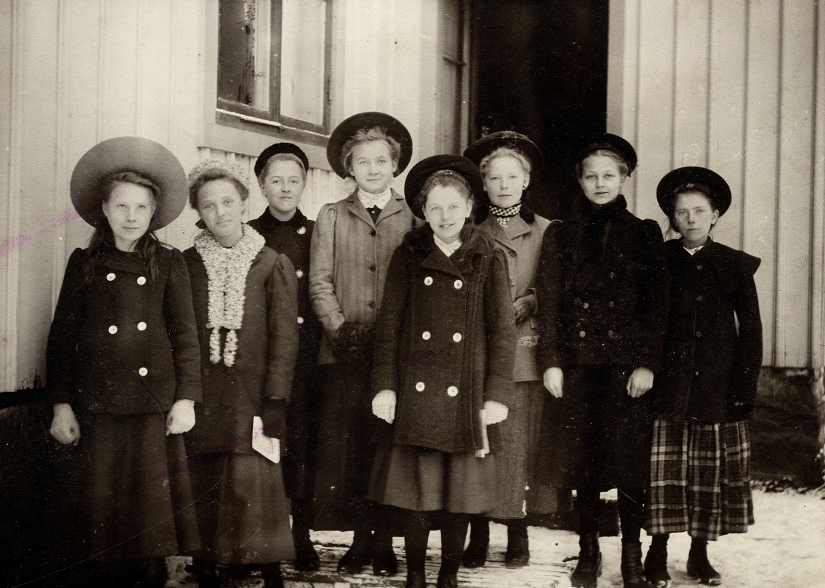 Från vänster: 1. Okänd. 2. Ester Jakobsson (1896 - 1926), Lilla Vommedal. 3. Gunhild Karlsson (1895 - 1967), Tollered. 4. Anna Johansson (1896 - 1988, gift Niklasson), Backen. 5. Anna Eugenia Andersson (1896 - 1962), Lugnet Norra Kyrkvägen. 6. Anna Johansson, Heljered. 7. Alida Karlsson (1896 - 1994, gift Ekström), Hallen. 8. Maria Klingvall (1895), Stretered/Sporred.