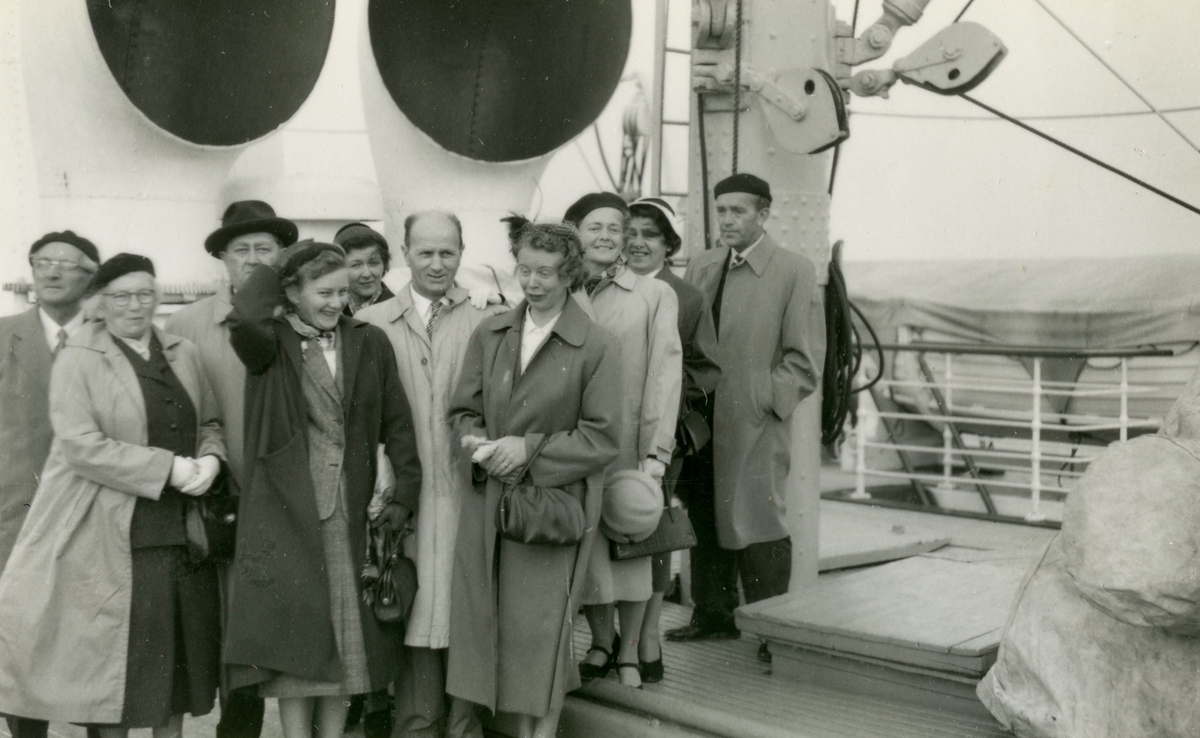 Kvällskryss med Sueziabåten till Danmark, år 1954. Från vänster: 1. Nils Petersson, Livered, 2. Ottilia Petersson, Livered (1882 - 1967), 3. John Persson (1909 - 1982), 4. Evelyn Petersson, Livered (1912 - 2000), 5. Iris Johansson Persson, Livered (1913 - 2004), 6. Erik Karlsson, Tollered, 7. Iréne Karlsson, Tollered (född 1912), 8. Rosa Pettersson, Torrekulla (1912 - 1994), 9. Tekla "Titti" Karlsson, Midsommarvägen (1902 - 1972) samt 10. Gunnar Karlsson, Vommedal (1901 - 1979). Relaterat motiv: A0012.