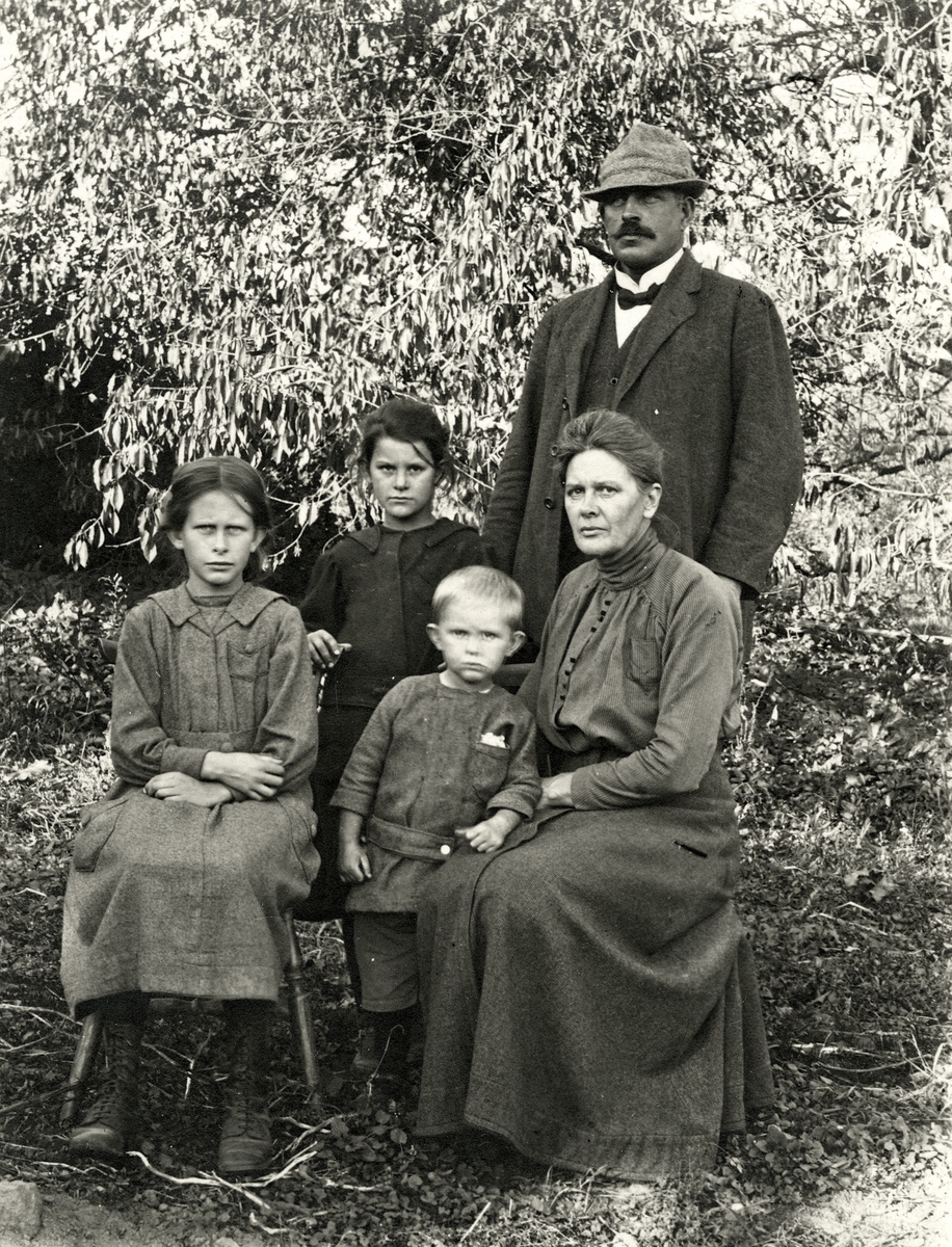 Familjen Scotte i Stretered år 1921. Johan Gustaf Johansson Scotte (född 1876 i Revesjö, Svenljunga, död 1949 i Kungsbacka), hustrun Klara Scotte (född Brodin 1875, död 1962 i Kungsbacka) med sina barn Gunborg* Elisabet (född 1911 i Agnetorp/Skaraborg, död 2002), Valborg Ingegerd* (född 1914 i Julita/Katrineholm, död 1981) och Gustaf Helmer* (född Gustaf Adolf/Borås 1918, död 2008 i Upplands Väsby). Paret Scotte gifte sig år 1908 och flyttade till Stretered 1924. Scotte var Stretered skolhems trädgårdsmästare och familjen bodde då i "Trädgårdsvillan". De flyttade till Släp/Särö år 1926.
