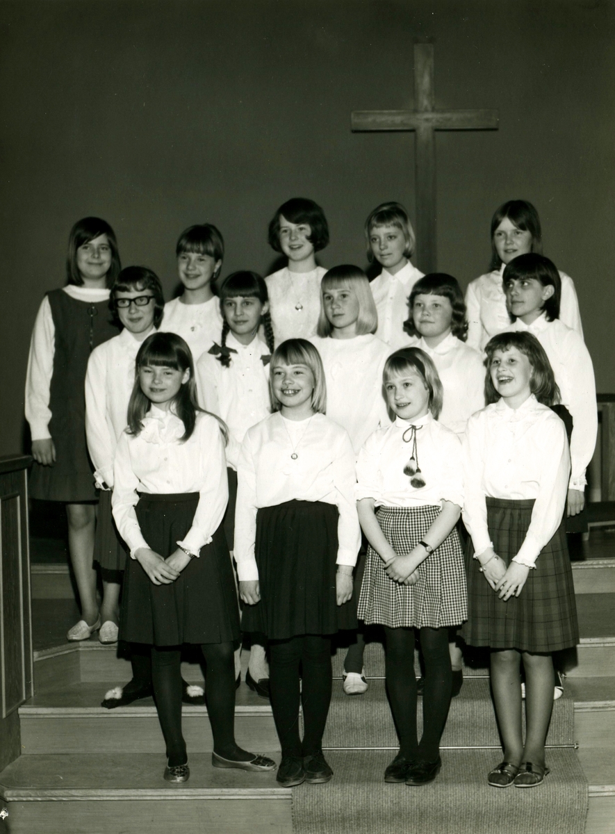 Flickkören (födda 1952 - 1958) står i lilla salen i Kållereds Missionskyrka, 1960-tal. Körledare var Ann-Marie Karlsson (ej i bild).