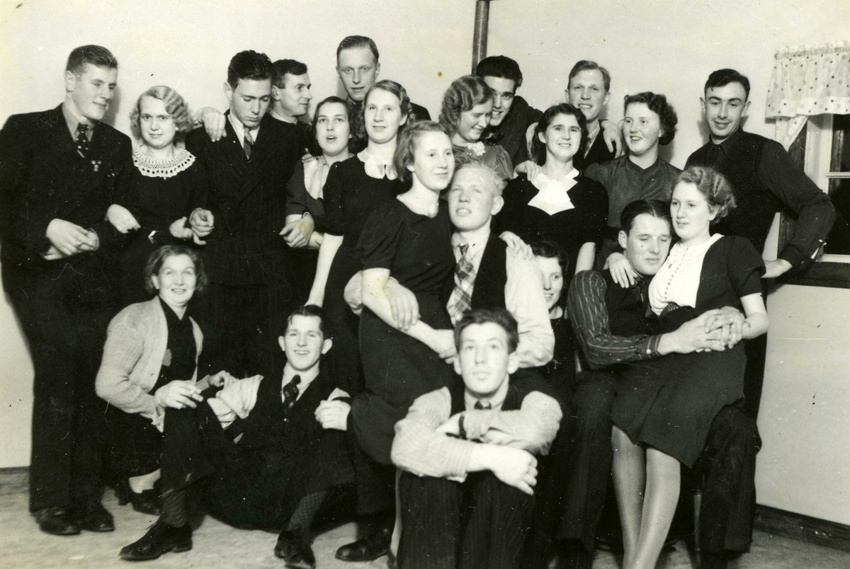 Avslutningsfest för de killar* (födda 1918) som skulle ut i militärtjänstgöring, Blå Bandföreningens stuga i Tulebo, vintern 1938 - 39. 1. Hildur Nilsson, Tulebo. 2. (sommargäst i Tulebo) Ingalill Dahlberg Börjesson, Burås, Göteborg. 3. Thure Johansson Bjerrhede*, Vommedal. 4. Gunnar Nilsson, Tulebo. 5. (sommargäst i Tulebo) Eivor Dahlberg Bjerrhede, Burås, Göteborg. 6. Rune Pettersson*, Klippan, Vommedal. 7. Okänd. 8. Harding Gustavsson*, Tomtebovägen, Kållered. 9. Kurt Johansson (1917 - 1995). 10. Kerstin Mattsson (1920 - 2007). 11. Dagmar Johansson Svensson, Vommedal. 12. Sven Svensson, Vommedal. 13. möjligen Ingrid Andersson Skansing eller hennes syster Astrid Andersson Dahl. 14. Inga-Britt Johansson (Dagmar Johansson Svenssons syster, tvilling med nr 20). 15. Kalle Nilsson, Tulebo. 16. Märta Andersson Nilsson, Livered. 17. Bertil Nilsson (1911 - 1976), Fagered, Lindome. 18. Kurt Andreasson. 19. Bertil Jägrud*, Hallen. 20. Ann-Marie Johansson (Dagmar Svenssons syster, tvilling med nr 14). 21. Nisse Winkvist, Tulebo. Relaterat motiv: A0736.