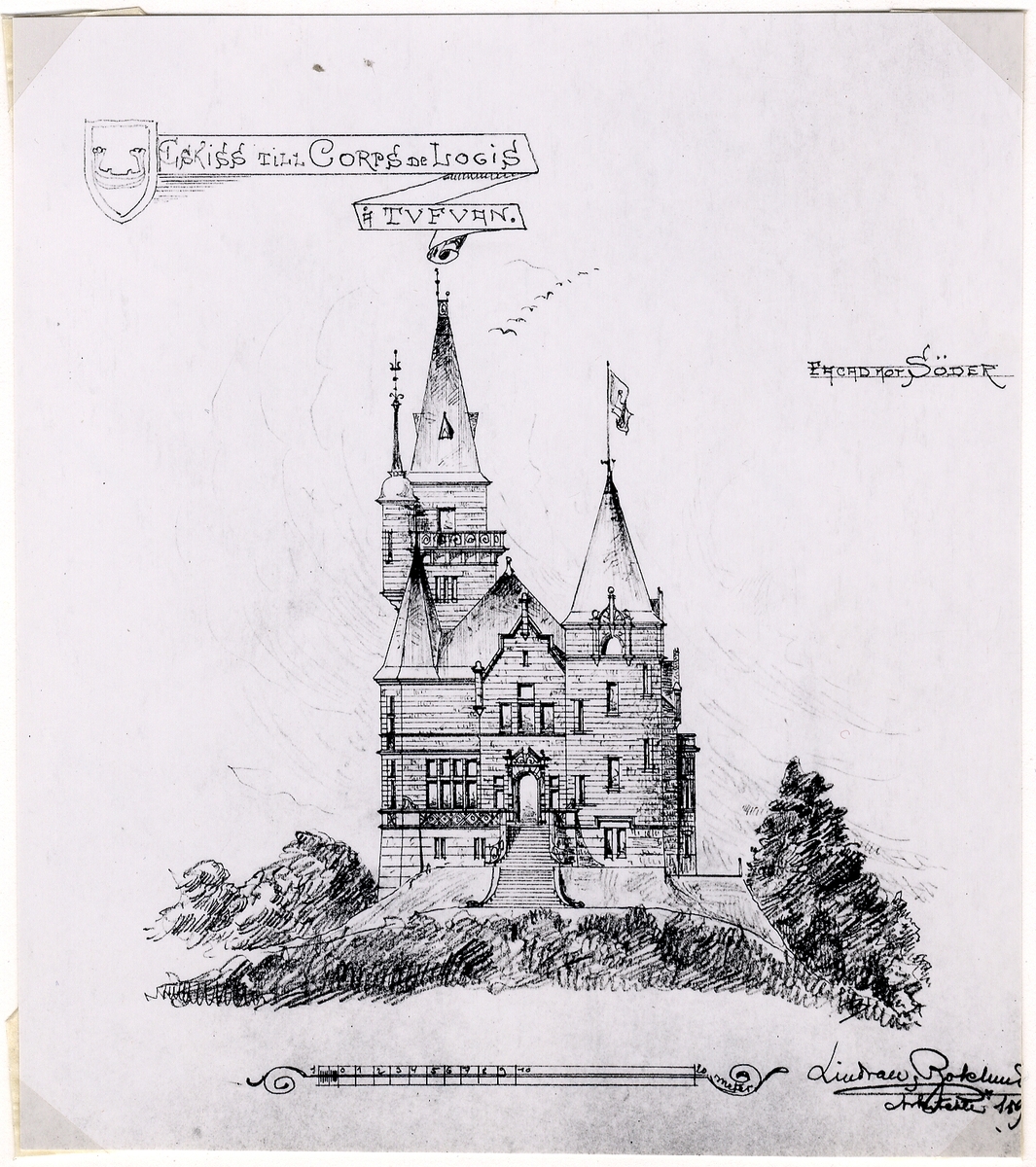 Ritning över Teleborgs slott. Exteriören åt söder.