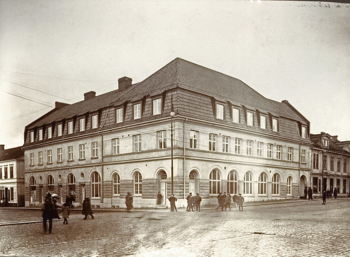 Sydsvenska Kreditaktiebolagets bank i hörnet Storgatan - Kungsgatan, ca. 1913.