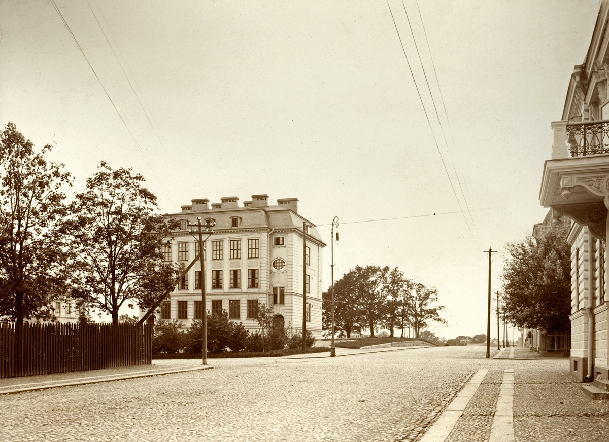 Trädgårdsgatan med Flickskolan, vid korsningen Värendsgatan. Söder i Växjö, ca. 1912.