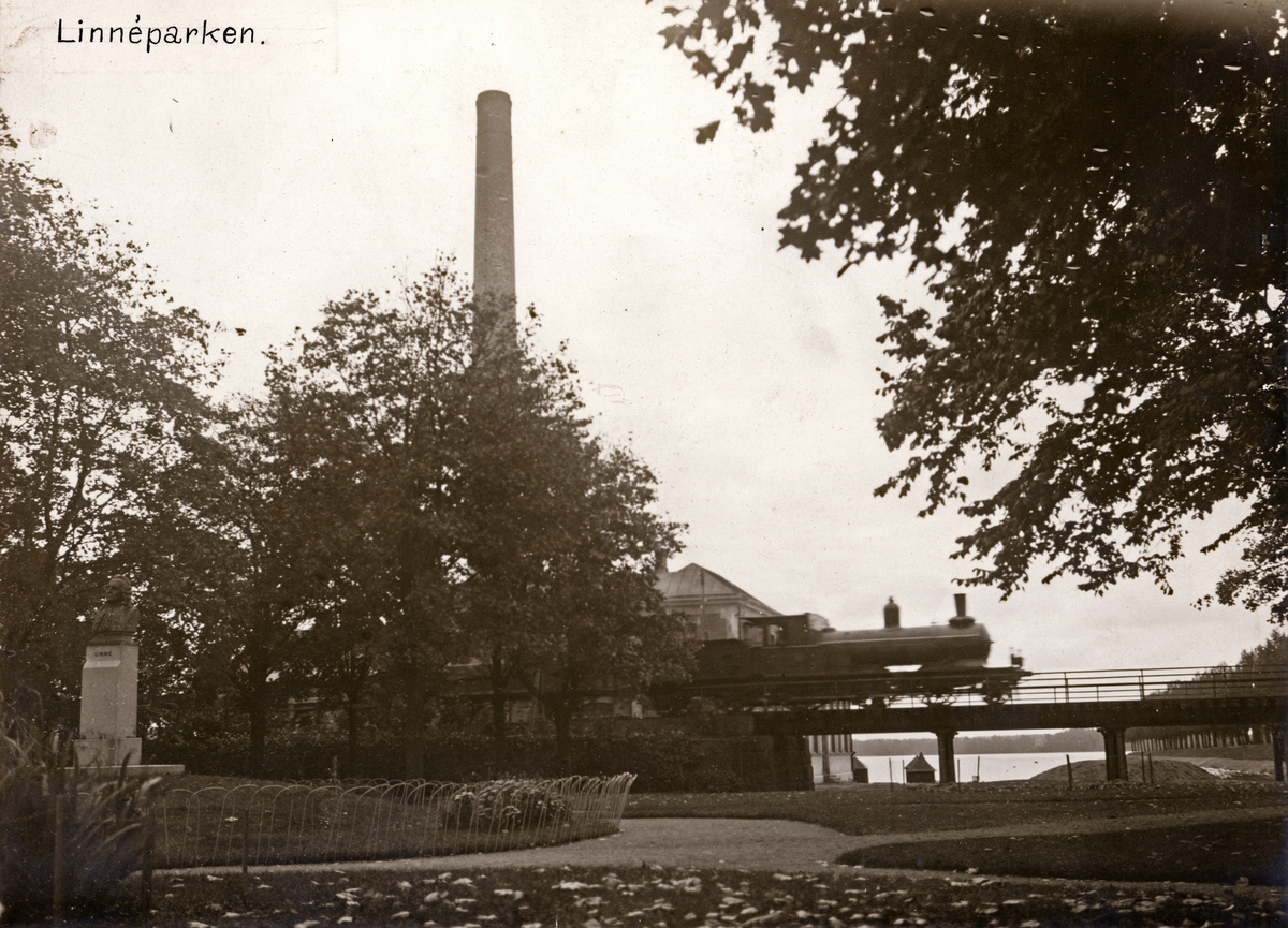 Järnvägsbron vid Linnéparken, med Elverket och Växjösjön i bakgrunden. Växjö, ca. 1912.
