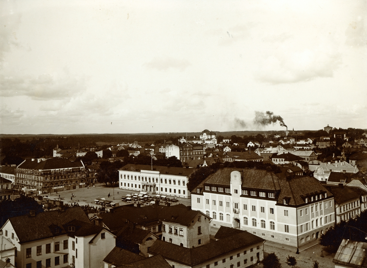 Marknadsdag på Stortorget. Växjö centrum från kyrktornet, 1912.