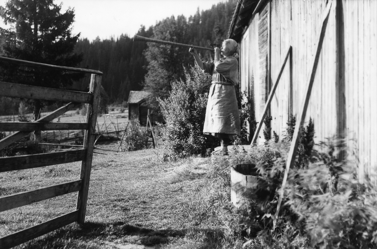 Trogsta, Forsa socken. Kvinna blåser i näverlur.