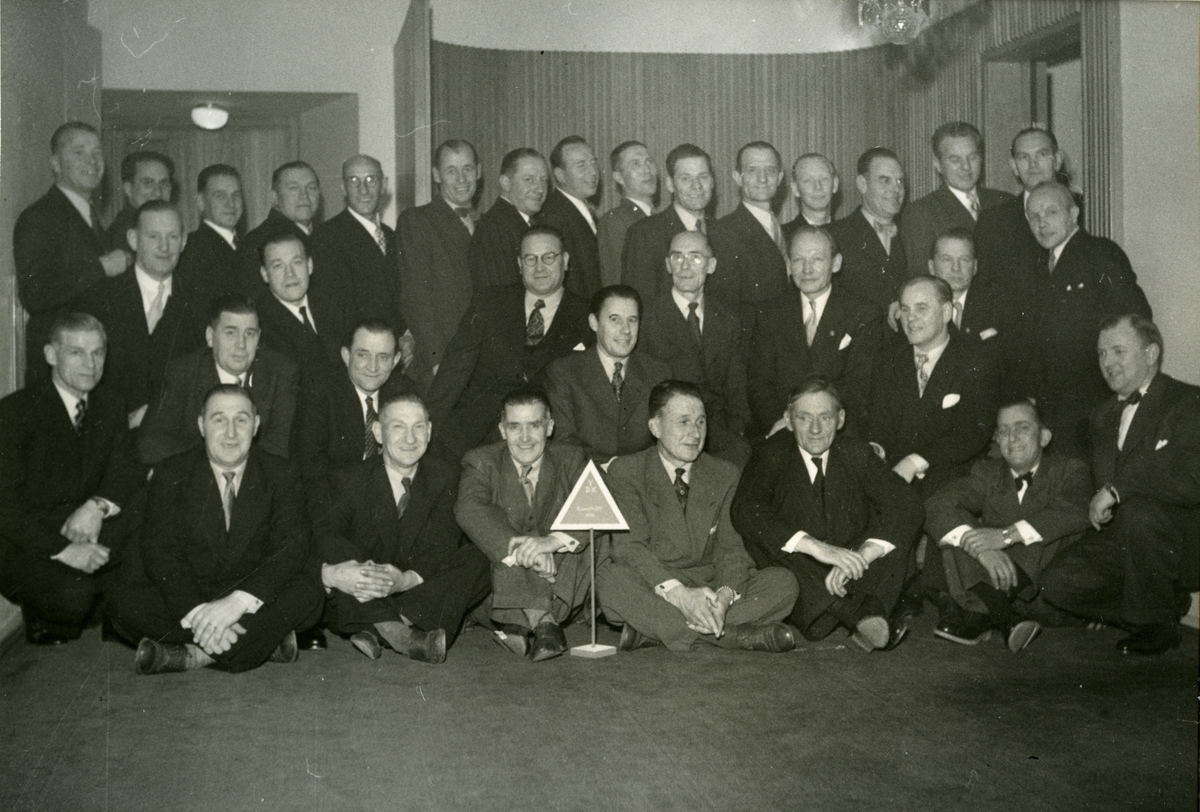 Medlemmar i fotbollsklubben Västra bollklubben från Gävle vid jubileum. I klubben spelade företrädesvis unga män från Gävle glasbruk och bryggeriet vid Gustavsbro. Henning Johannesson sitter längst fram i mitten och två från vänster andra raden nerifrån halvsitter hans bror Helmer Johannesson.