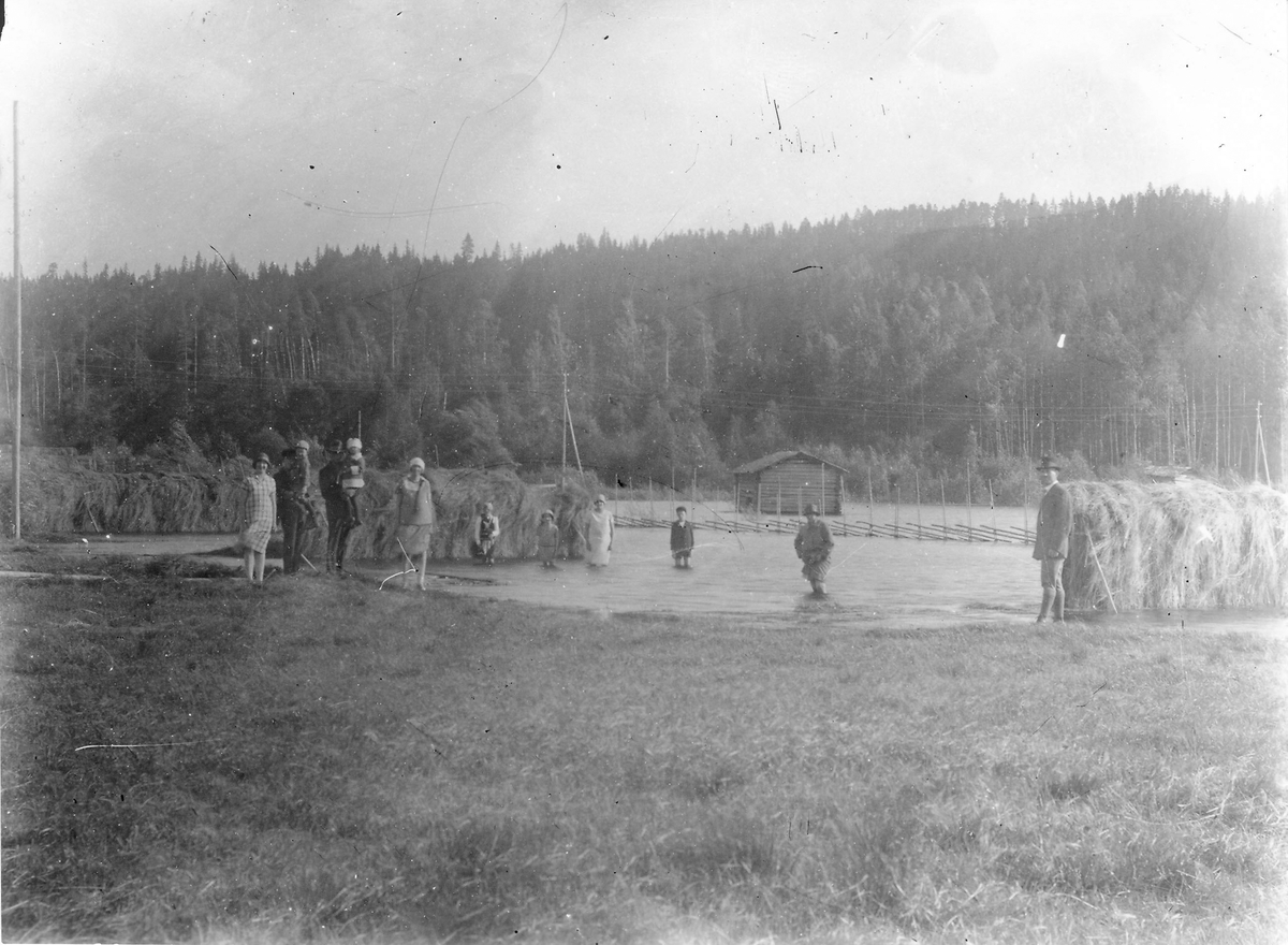 Översvämning i Östansjö. Längst till höger Lars Jonsson och hans hustru Stina. Ester Lindberg är troligen med på bilden, övriga okända.