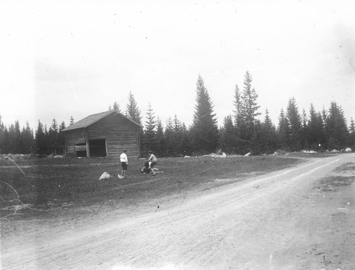 Lekande barn framför lada.