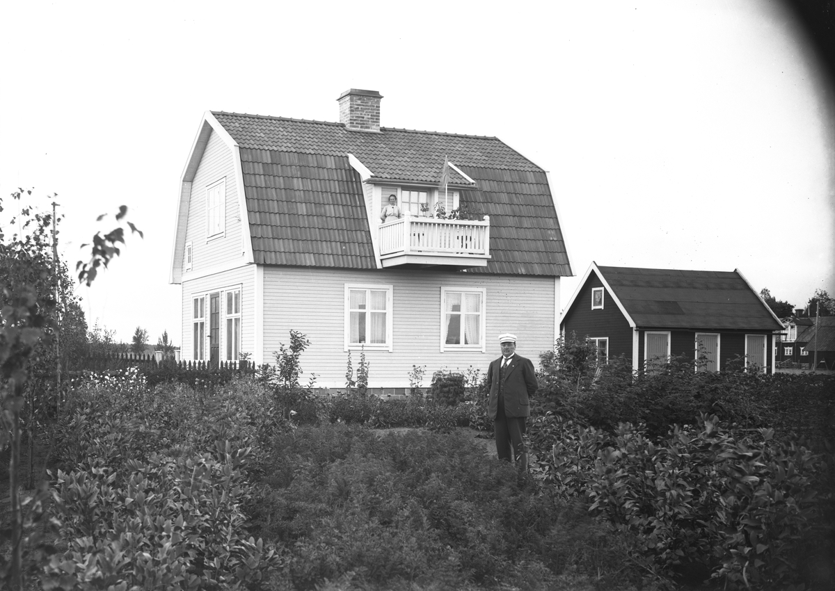 Man utanför bostadshus, kvinna på balkonen.