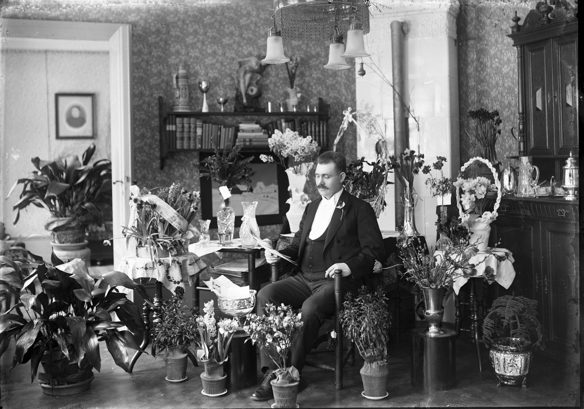 Man omgiven av blommor vid ett jubileum/firande.