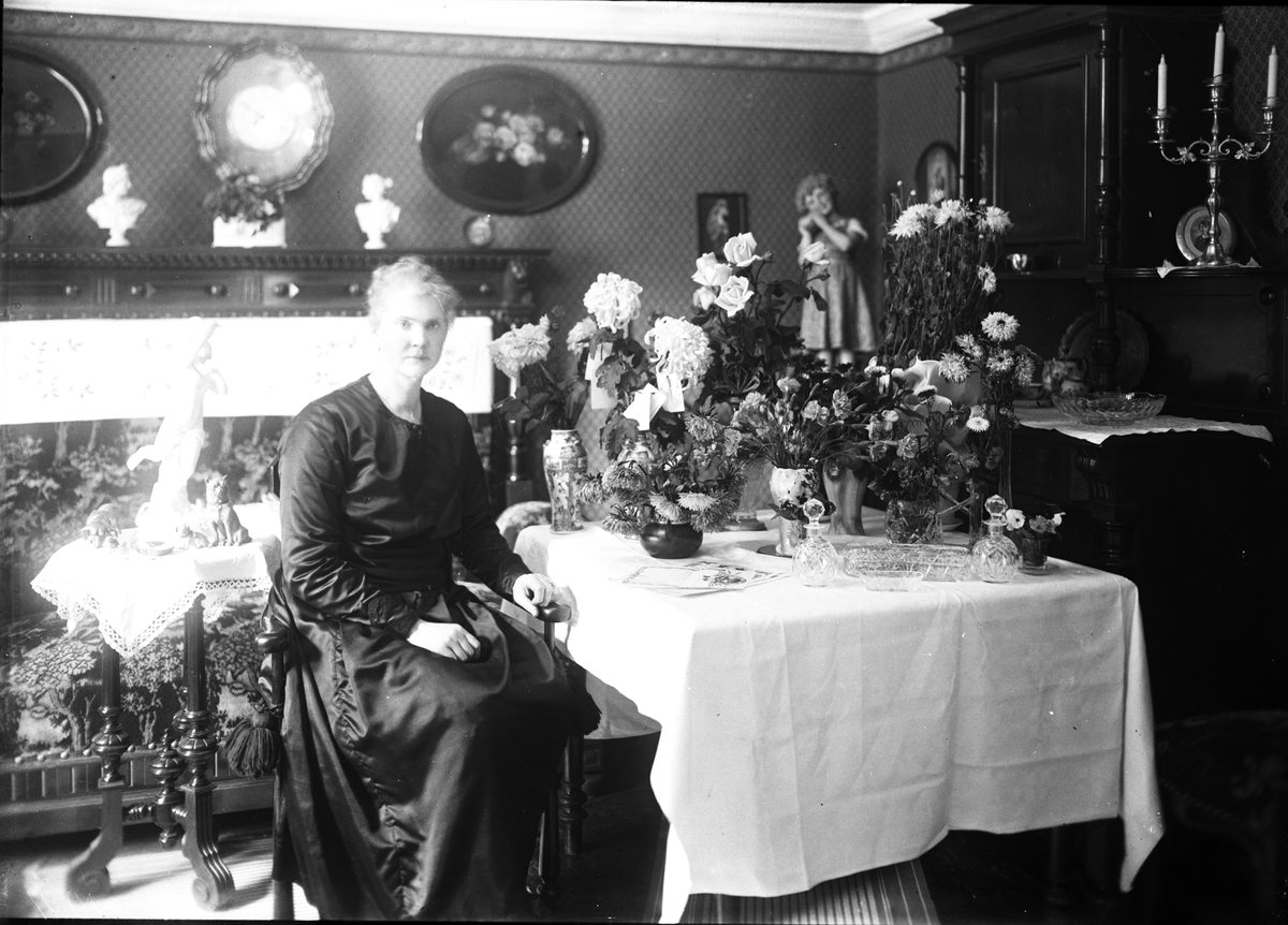Kvinna vid blomsteruppsättningar, födelsedagsporträtt.