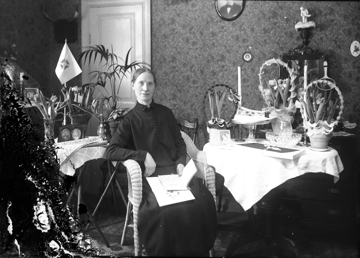 Kvinna i korgstol.