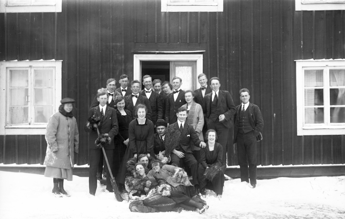 Ungdomsgäng vid "Erik-Larsgården", Wästra Hästbo. Josef Eriksson sittande i mitten med pälsmössa. Längst till höger Einar Larsson, Åsmundshyttan.