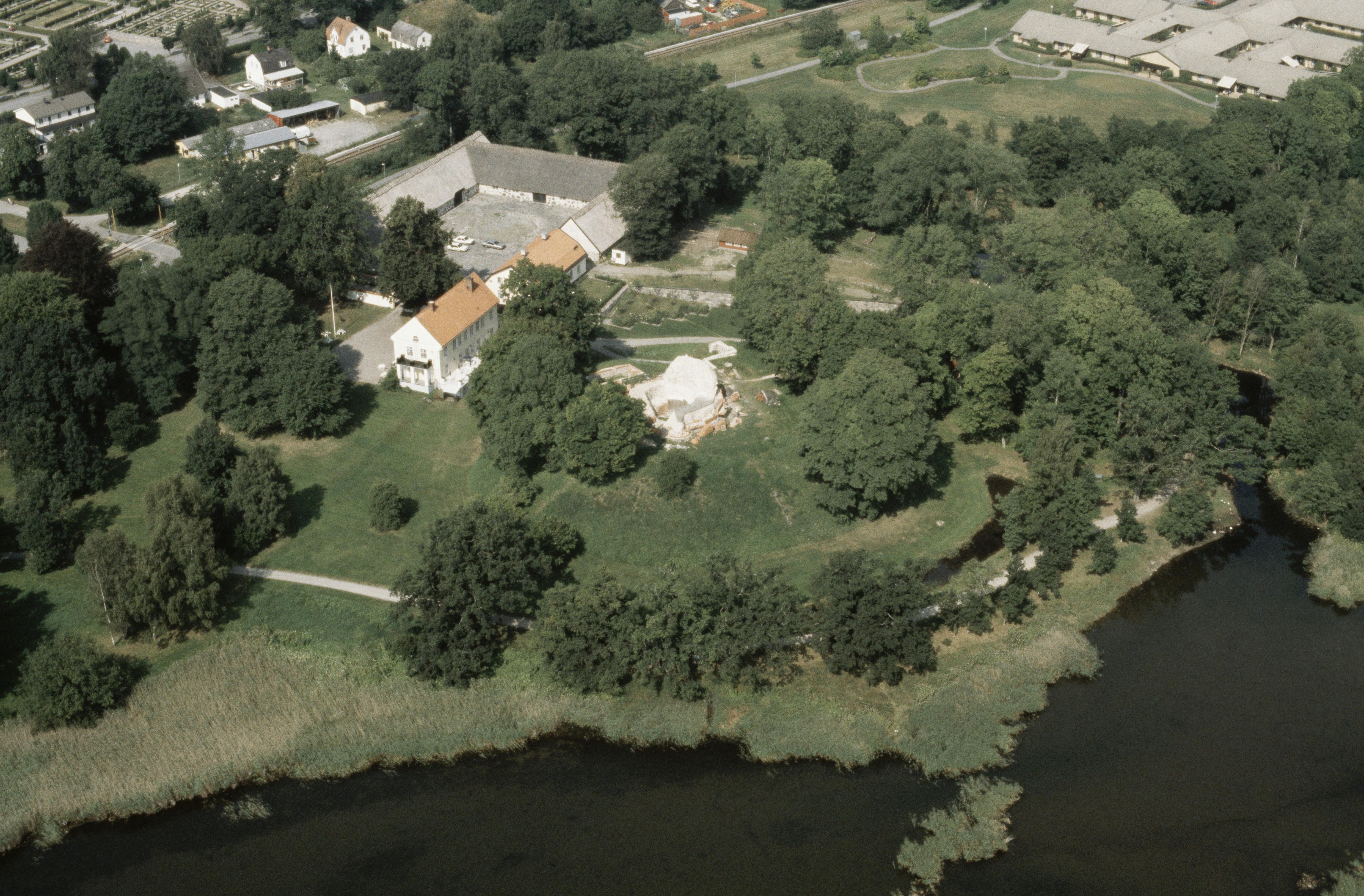 Sölvesborgs slott vid Sölvesborgsviken. Till höger om slottet slottsruin RAÄnr Sölvesborg 17:1. Bilden är tagen mot (väderstreck): N