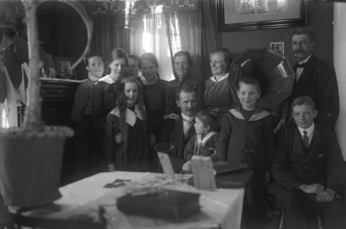 Gruppbild, barn och vuxna vid trattgrammofon.