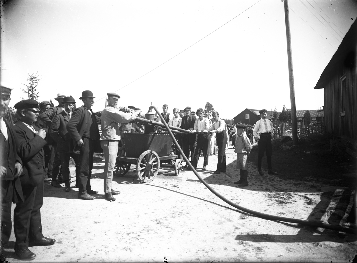 Brandkåren i Hamrånge, utryckning. Brandpump på vagn.