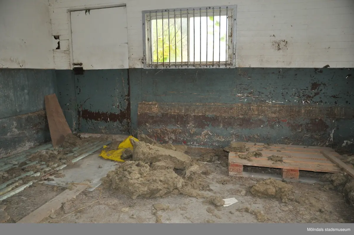 Interiörfotografi av stall på fastigheten Ranntorp 2:20 i Ranntorp, Lindome, i Mölndals kommun. Fotografiet är taget den 22/10 2014. Byggnadsdokumentation inför rivning.