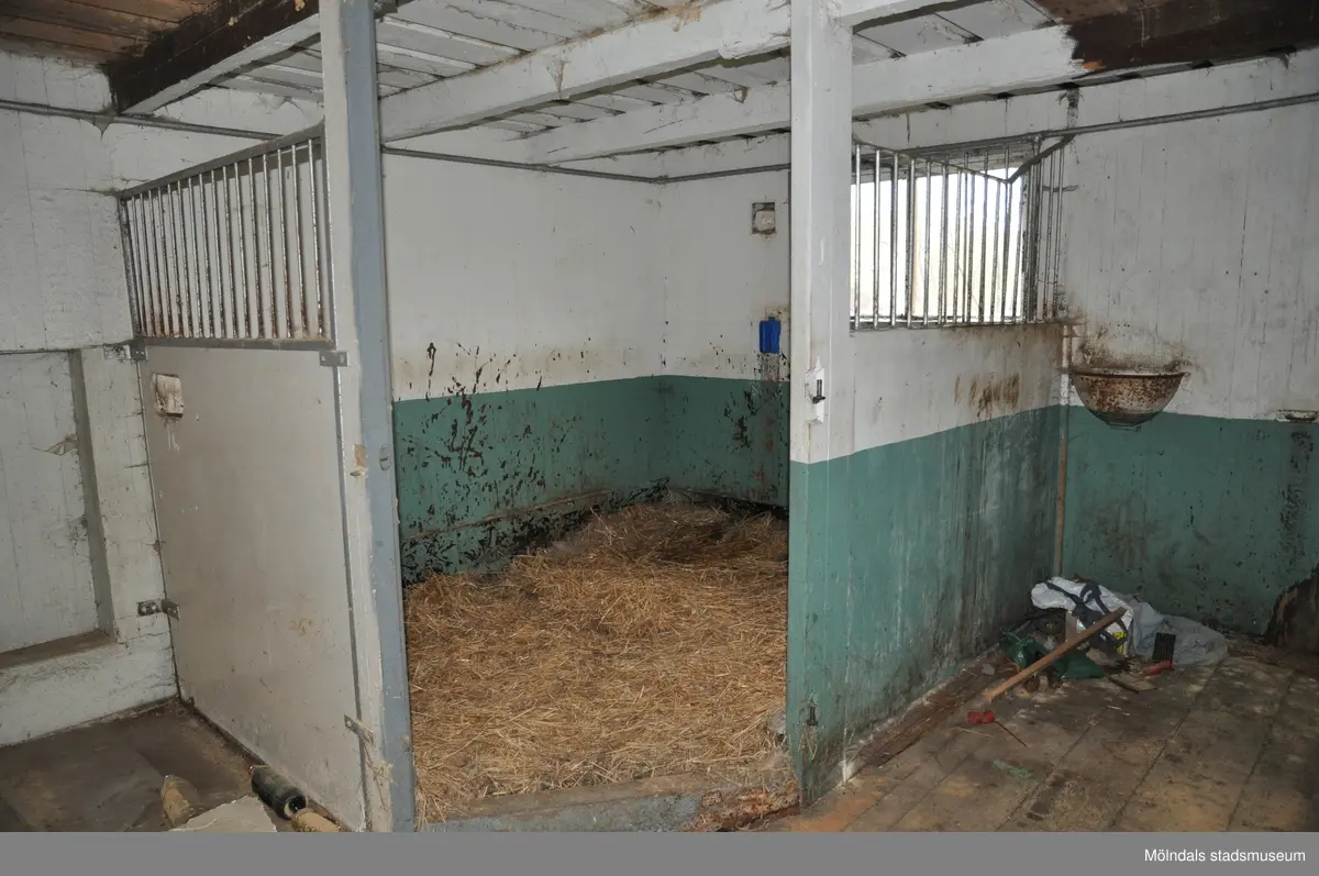 Interiörfotografi av stall på fastigheten Ranntorp 2:20 i Ranntorp, Lindome, i Mölndals kommun. Fotografiet är taget den 22/10 2014. Byggnadsdokumentation inför rivning.