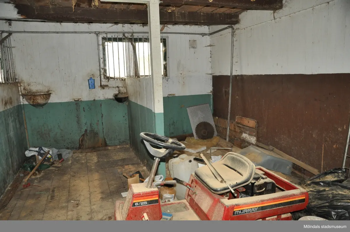 Interiörfotografi av stall på fastigheten Ranntorp 2:20 i Ranntorp, Lindome, i Mölndals kommun. Fotografiet är taget den 22/10 2014. Byggnadsdokumentation inför rivning.
