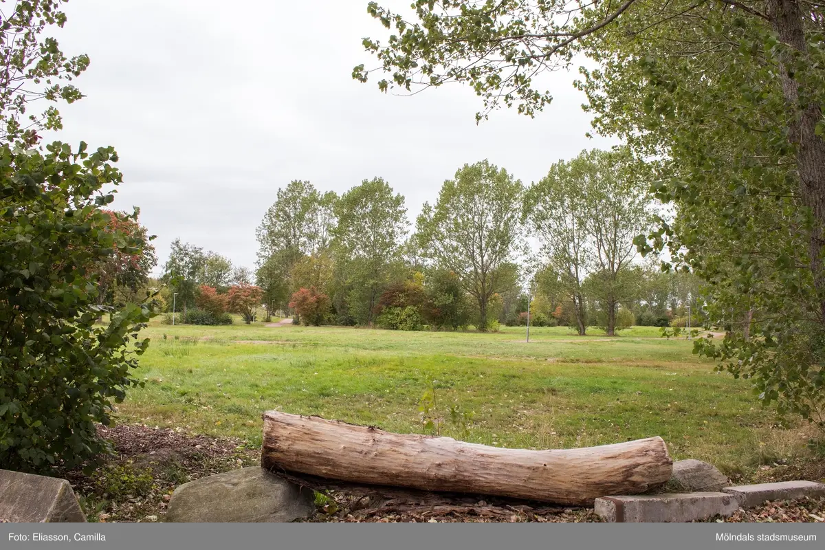 Grönområde intill friidrottsarenan Åby Friidrott i Åby, Mölndal, den 11 oktober 2016. Området är försett med elljusupplysta gångstigar.