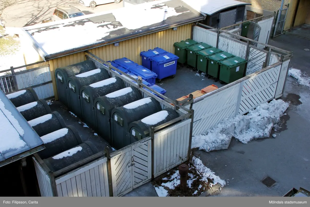 Vy från ovan mot miljöstation belägen på gårdssidan av hus på Bergmansgatan i Mölndals Centrum. Fotografi taget den 26 februari 2018. Byggnadsdokumentation inför rivning.