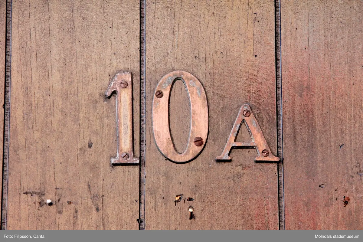 Nummer på ytterdörr. Byggnadsdetalj från lägenheten Bergmansgatan 10 A i Mölndals Centrum. Fotografi taget den 26 februari 2018. Byggnadsdokumentation inför rivning.
