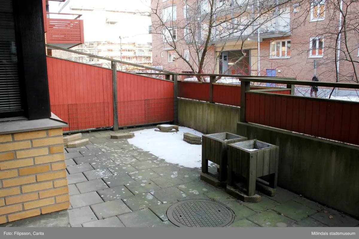 Uteplats till en av lägenheterna med adress Bergmansgatan 10 i Mölndals Centrum. Sydöstra sidan. Fotografi taget den 27 februari 2018. Byggnadsdokumentation inför rivning.
