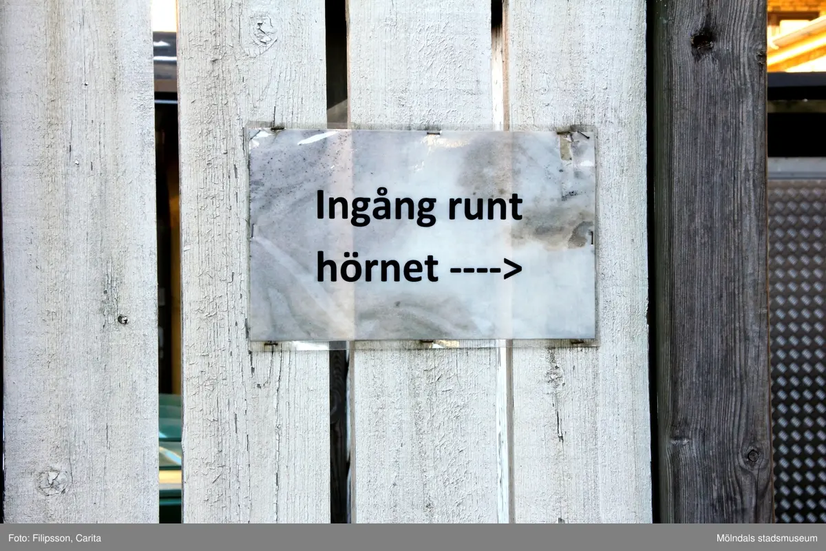 Vägvisning till miljöhus på gårdssidan av hus på Bergmansgatan i Mölndals Centrum. Fotografi taget den 26 februari 2018. Byggnadsdokumentation inför rivning.