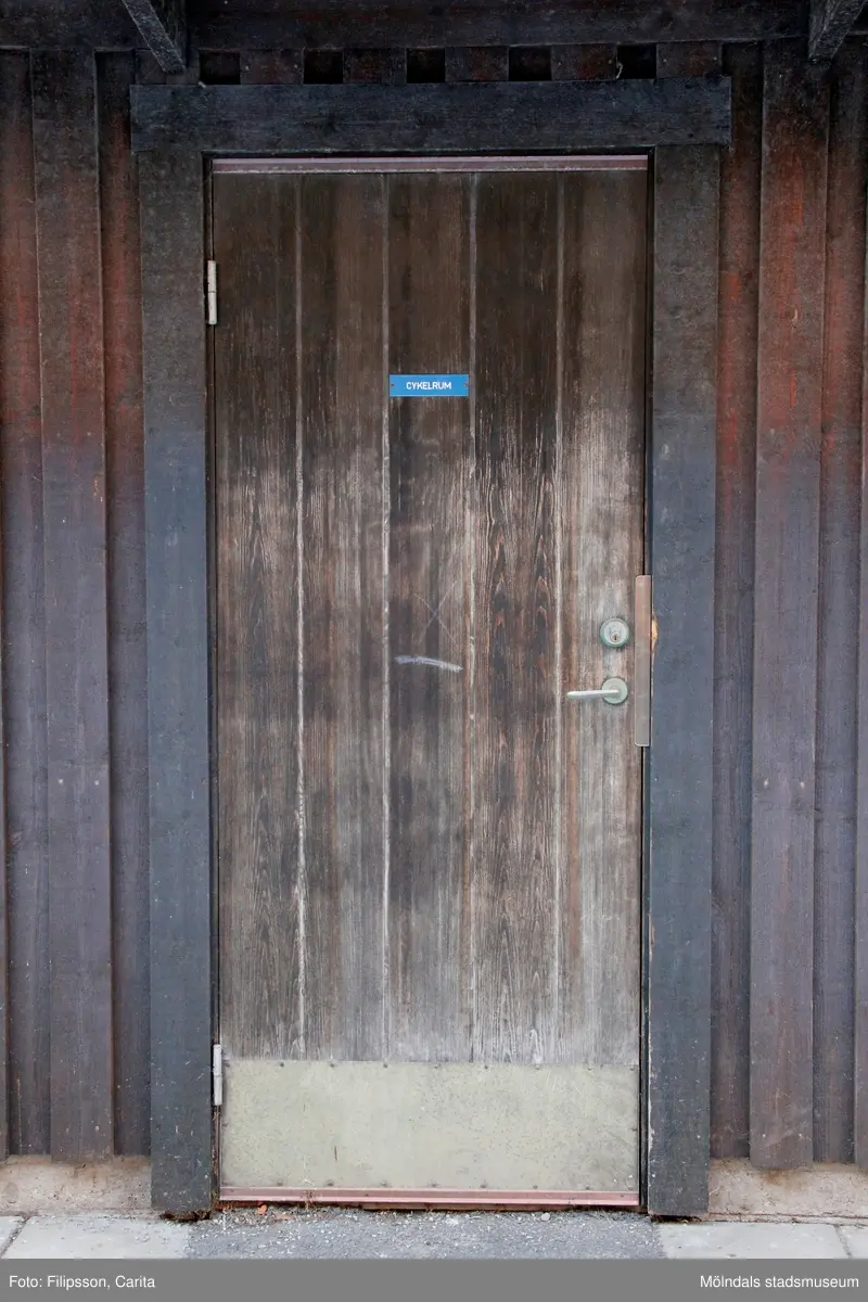 Ytterdörr till cykelrum tillhörande husen Bergmansgatan 4, 6, 8 och 10 i Mölndals Centrum. Fotografi taget den 26 februari 2018. Byggnadsdokumentation inför rivning.
