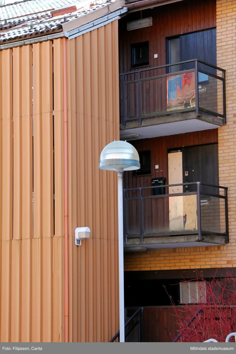 Gårdslampa, trapphus och loftgång. Gårdssidan av huset som har adressen Bergmansgatan 8 i Mölndals Centrum. Fotografi taget den 26 februari 2018. Byggnadsdokumentation inför rivning.