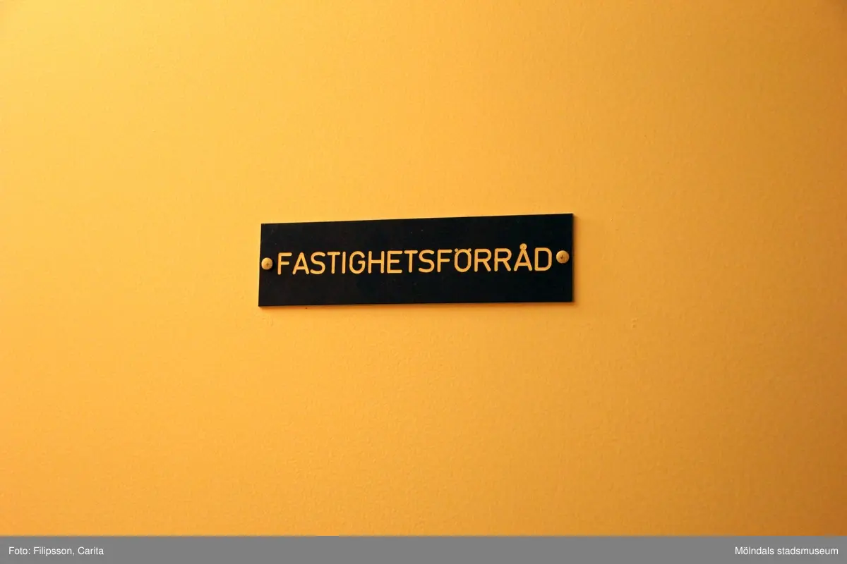 Skylt med texten "FASTIGHETSFÖRRÅD" i källare till något av husen med adresserna Bergmansgatan 4, 6, 8 och 10 i Mölndals Centrum. Fotografi taget den 27 februari 2018. Byggnadsdokumentation inför rivning.