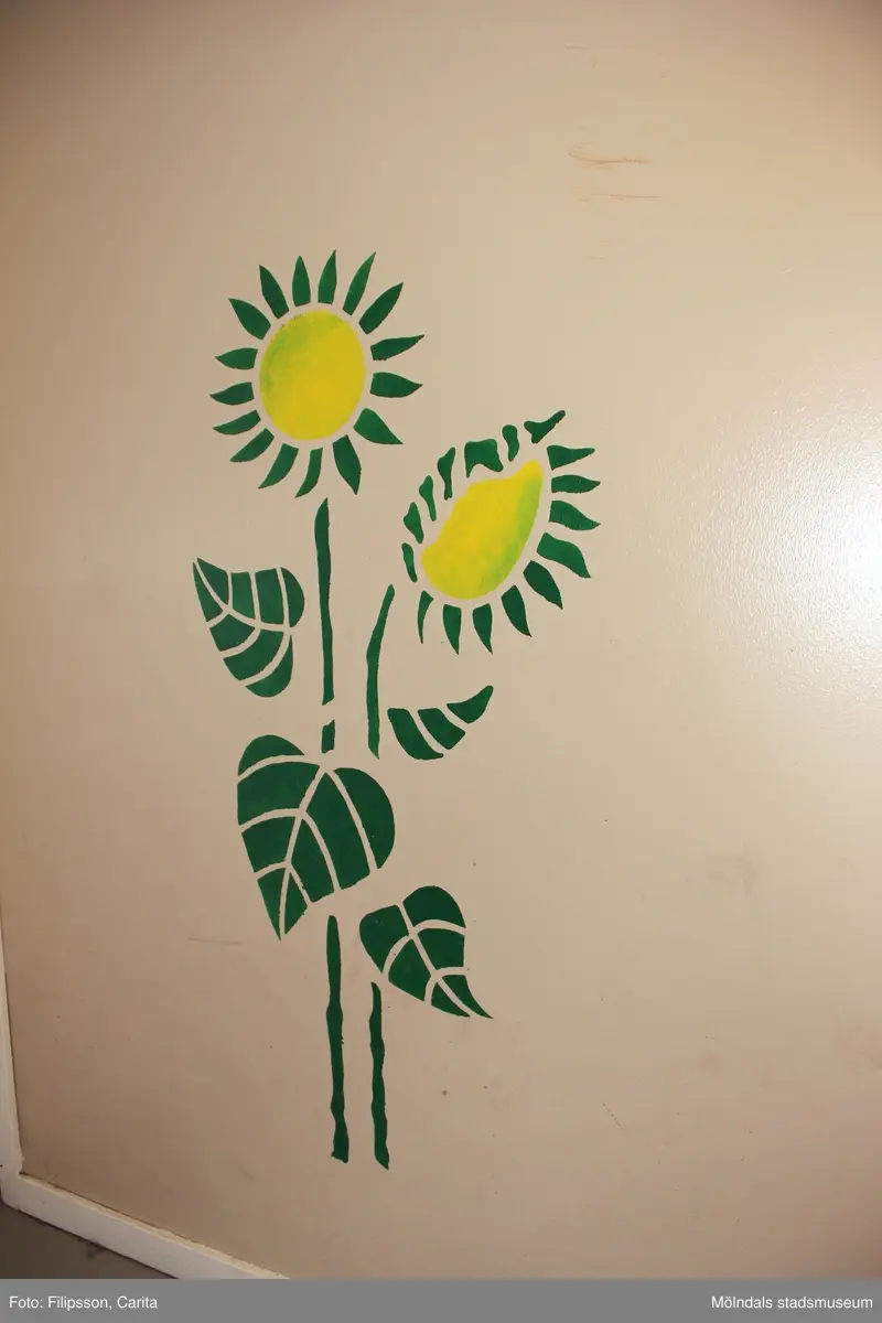 Väggmålning av solrosor i källaren till något av husen med adresserna Bergmansgatan 4, 6, 8 och 10 i Mölndals Centrum. Fotografi taget den 27 februari 2018. Byggnadsdokumentation inför rivning.