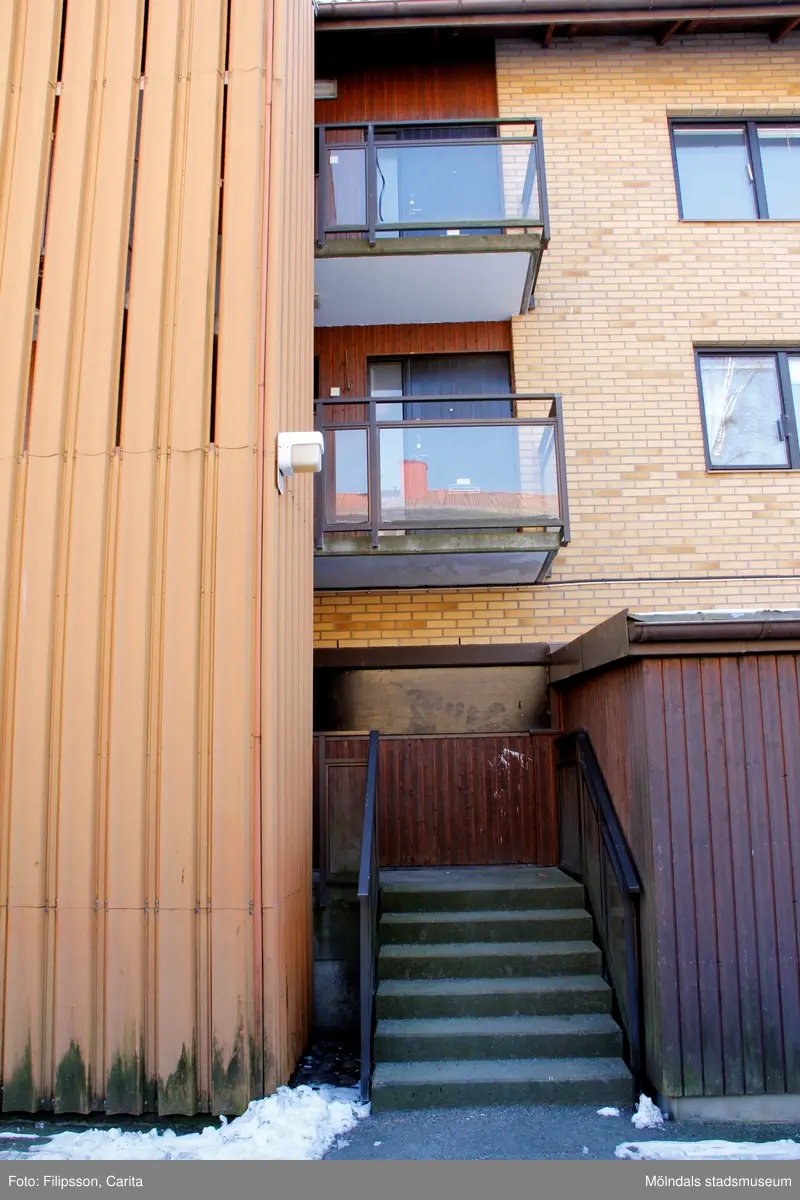 Loftgångstrapphus till bostadshuset Bergmansgatan 4A i Mölndals Centrum. Del av husets fasad som vetter mot gårdssidan. Fotografi taget den 26 februari 2018. Byggnadsdokumentation inför rivning.