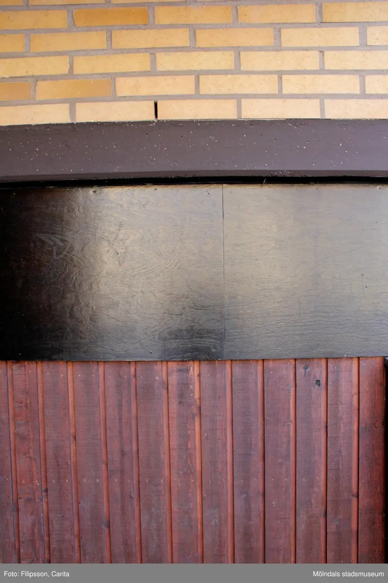 Materialmöten. Detalj av fasaden till något av bostadshusen med adresserna Bergmansgatan 4, 6, 8 och 10 i Mölndals Centrum. Fotografi taget den 26 februari 2018. Byggnadsdokumentation inför rivning.