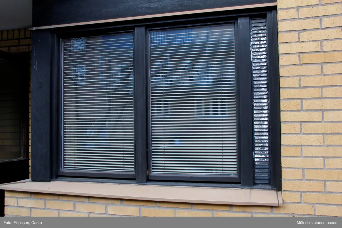 Materialval. Fönster till något av bostadshusen med adresserna Bergmansgatan 4, 6, 8 och 10 i Mölndals Centrum. Fotografi taget den 27 februari 2018. Byggnadsdokumentation inför rivning.