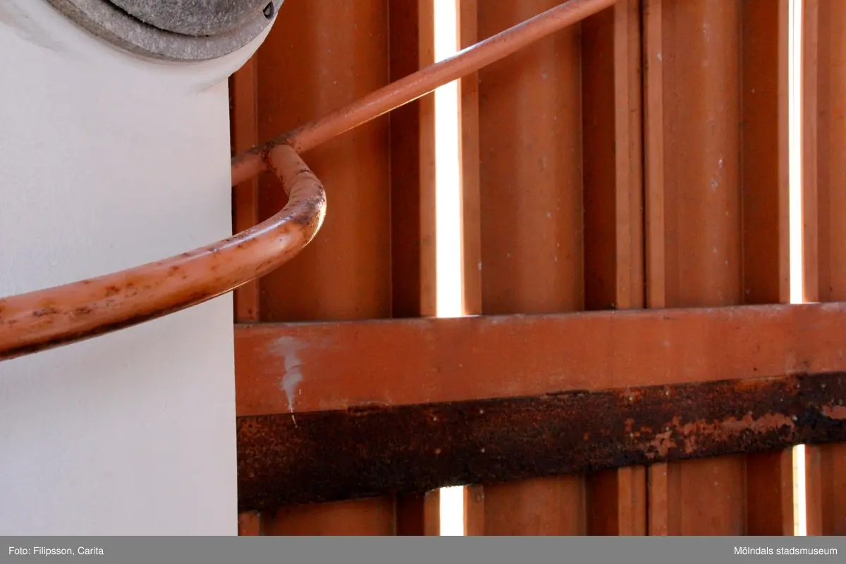 Materialval ledstång. Byggnadsdetalj från loftgångstrapphus till något av bostadshusen med adresserna Bergmansgatan 4, 6, 8 och 10 i Mölndals Centrum. Fotografi taget den 26 februari 2018. Byggnadsdokumentation inför rivning.